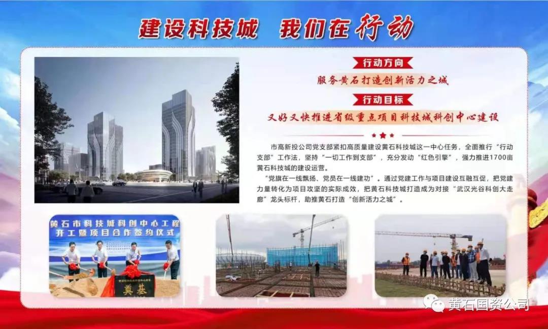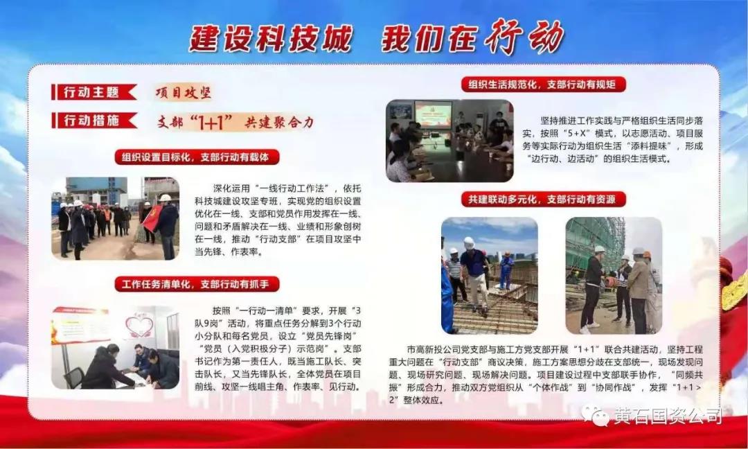 市高新投黨支部隸屬于市國資公司黨委,自成立以來,該支部全面推行“行動支部”工作法:支部工作在工地、黨員活動在工地、作用發(fā)揮在工地,將黨的建設與項目建設結合起來,以“服務黃石打造創(chuàng)新活力之城”為行動方向,以“又好又快推進省級重點項目科技城科創(chuàng)中心建設”為行動目標,以“項目攻堅”為行動主題,以“青春正當時,我們不一樣”為行動口號,創(chuàng)新開展“1+1”黨員攻堅、抗洪搶險行動和“筑堅強堡壘·建過硬隊伍”能力提升活動,建立黨員攻堅突擊隊,設置黨員示范崗,激勵黨員積極投身干事創(chuàng)業(yè)活動。